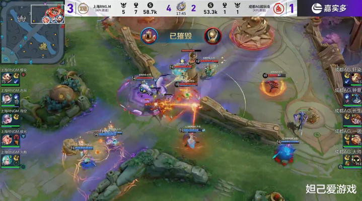 当我们将视野放回双方第五局,此时RNGM手握赛点,前期打的也是异常凶猛,樱花使用的曹操前期就拿到了四个人头,而RNGM也是凭借阵容与人头的优势,疯狂蚕食着AG的野区。比赛进入后期,AG甚至只剩下一个中路高地塔,但此时RNGM还有八座防御塔,理论上来说,只要RNGM足够稳定,是可以慢慢啃下AG的。