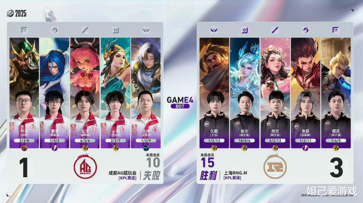在后续的两场比赛中,AG轩染先用一手夏洛特将比分扳平,来到巅峰对决后,AG钟意、一诺分别拿出了自己的FMVP英雄,直接碾压对手将比赛的胜利拿下,险胜RNGM。